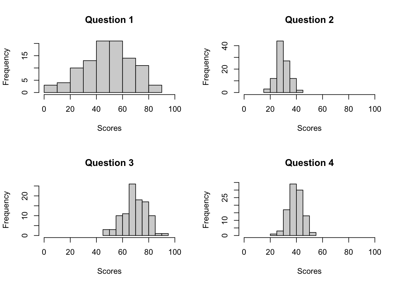 One of the best uses of a loop is to create multiple graphs quickly and easily. Let’s use a loop to create 4 plots representing data from an exam containing 4 questions. The data are represented in a matrix with 100 rows (representing 100 different people), and 4 columns representing scores on the different questions. The data are stored in the yarrr package in an object called examscores. Here are how the first few rows of the data look