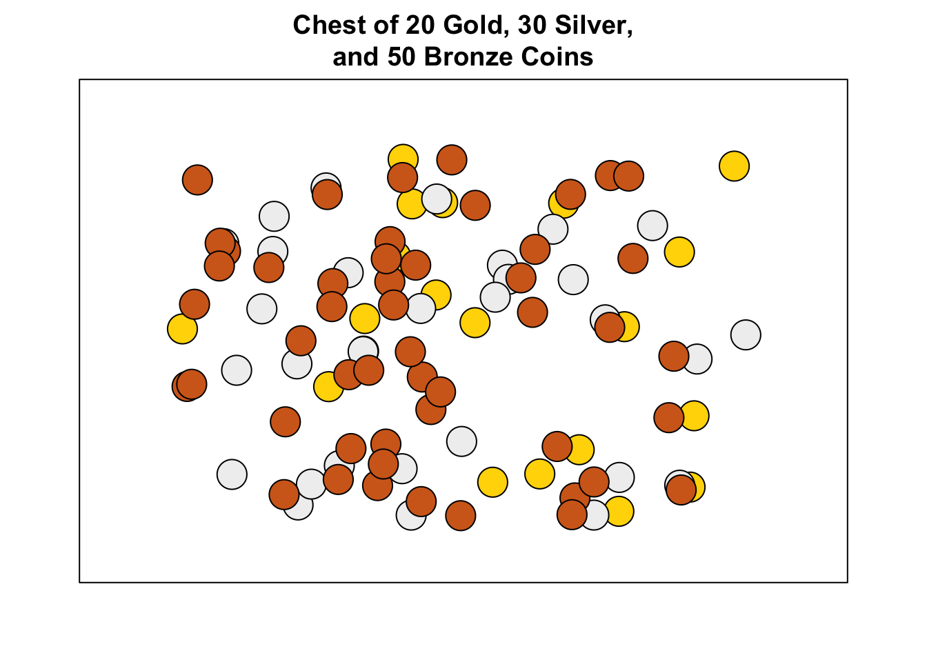 Now, let’s sample drawing coins from a treasure chest. Let’s say the chest has 100 coins: 20 gold, 30 silver, and 50 bronze. Let’s draw 10 random coins from this chest.