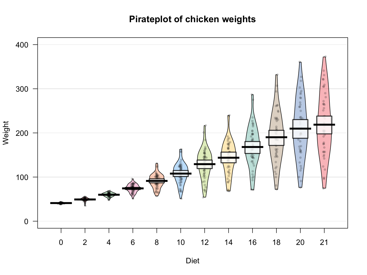 Let’s create a pirateplot of the ChickWeight data. I’ll set the dependent variable to weight, and the independent variable to Time using the argument formula = weight ~ Time: