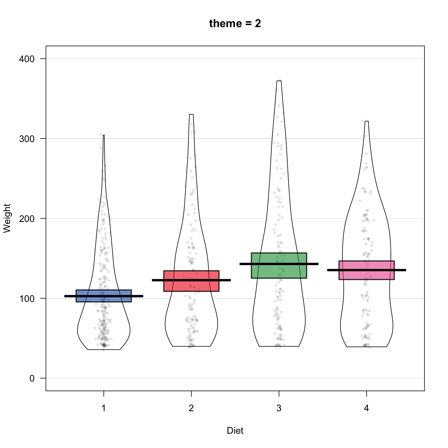 There are many different pirateplot themes, these themes dictate the overall look of the plot. To specify a theme, just use the theme = x argument, where x is the theme number: