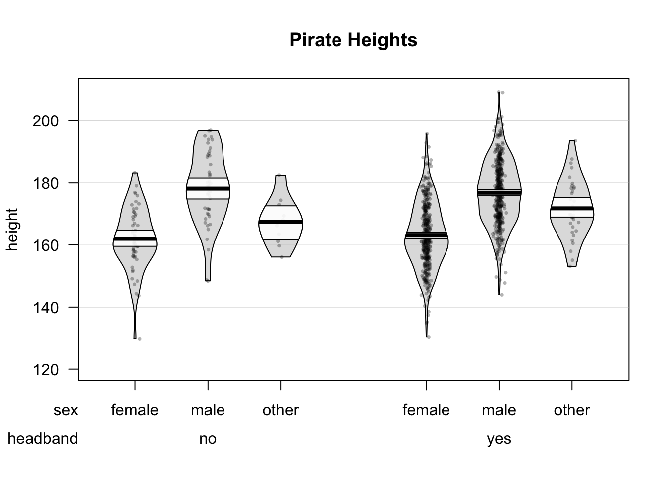yarrr::pirateplot(formula = height ~ sex + headband, # DV = height, IV1 = sex, IV2 = headband