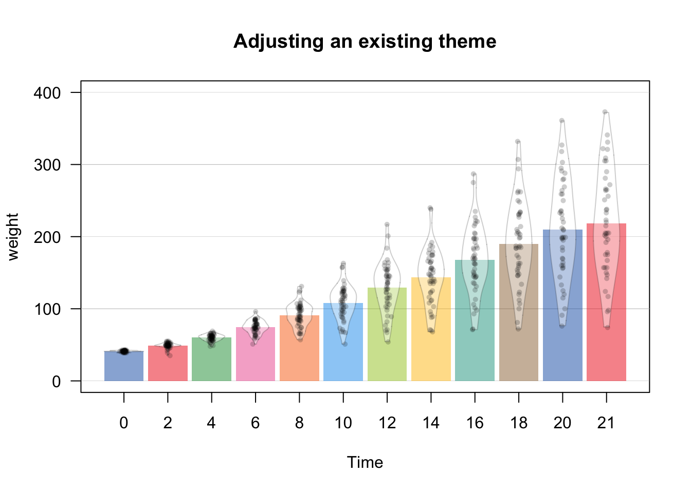 yarrr::pirateplot(formula = weight ~ Time, # dv is weight, iv is Diet