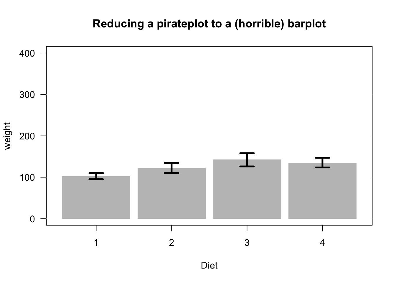 Just to drive the point home, as a barplot is a special case of a pirateplot, you can even reduce a pirateplot into a horrible barplot: