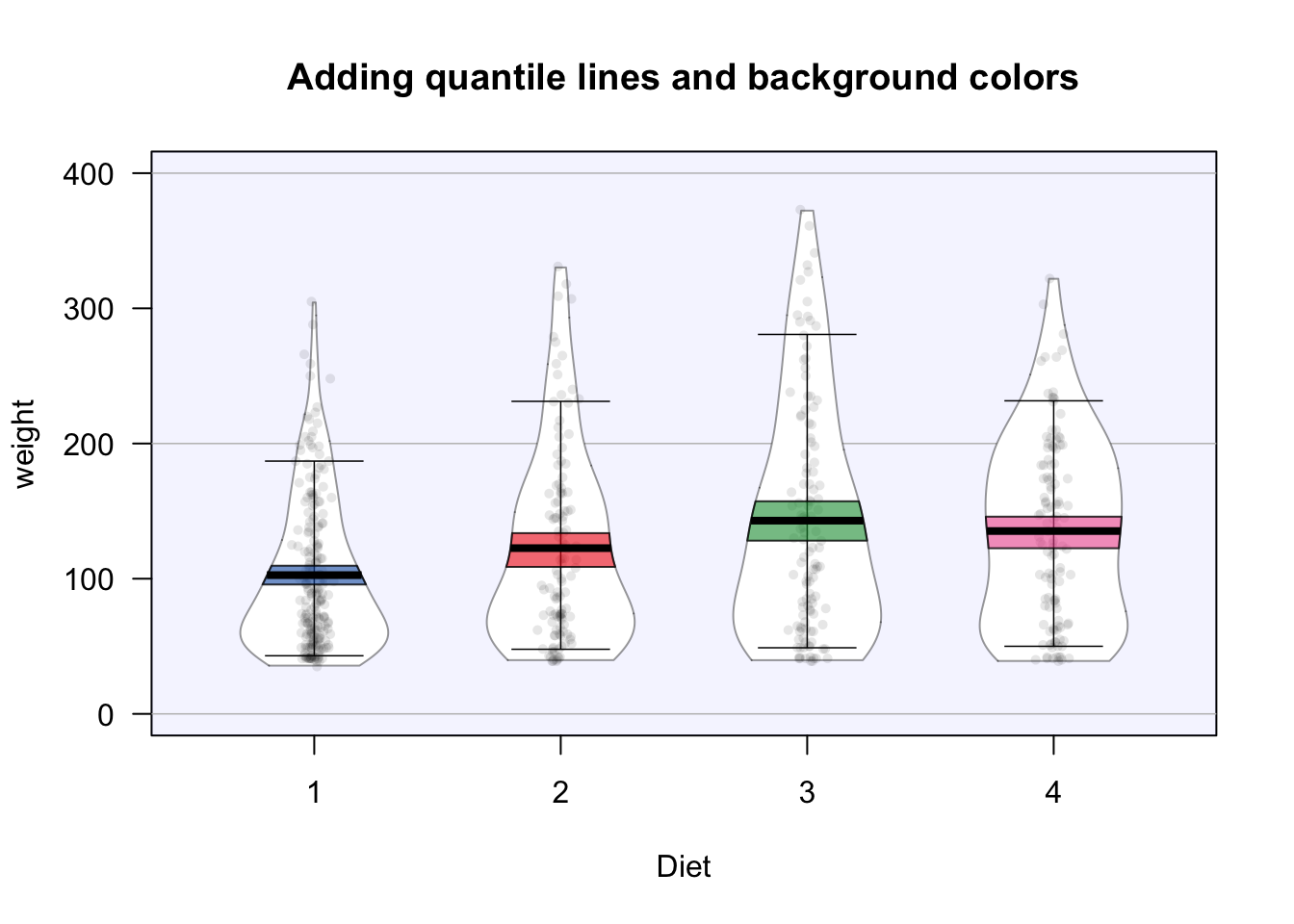 pirateplot(formula = weight ~ Diet,