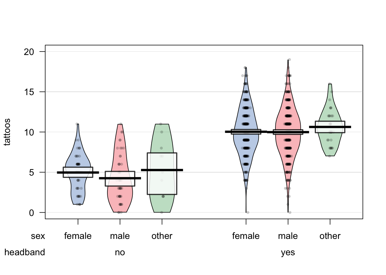 tattoos.pp <- pirateplot(formula = tattoos ~ sex + headband,